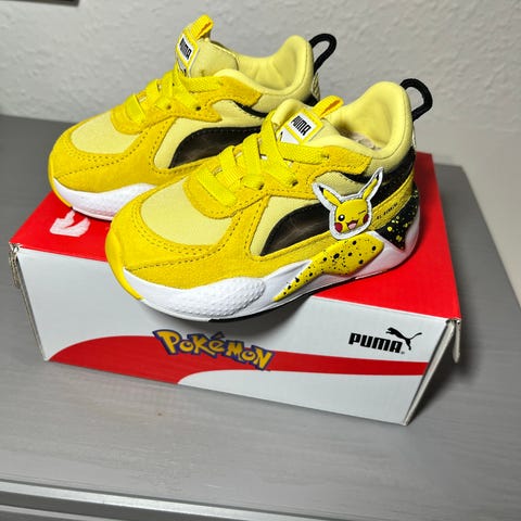 Par børnesko i størrelse 27 med Pokémon-tema, primært featuring Pikachu. Skoene er primært blå med gule og sorte detaljer. De har en velcro-lukning for nem på- og aftagning, samt en hvid skridsikker sål med blå detaljer. Motiv af Pikachu på siden og 'Pokémon' skrevet på velcrostroppen. Sålen viser tegn på brug med snavs mærker. Skoene er lette og designet til komfort.