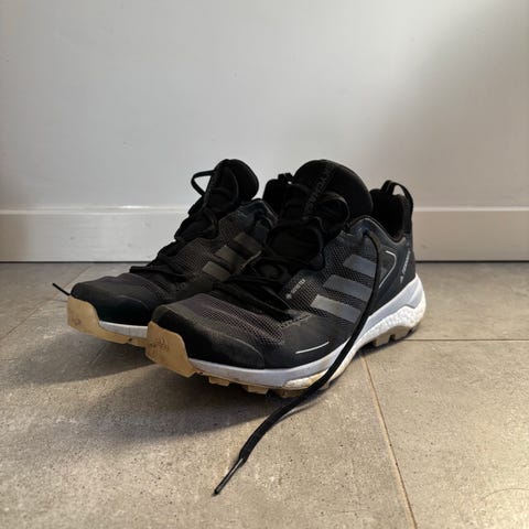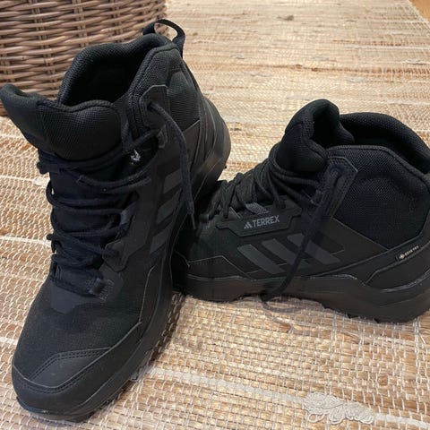 Adidas Terrex vandresko i størrelse 38,5. Stort set ikke brugt. Skoene er lavet med en slidstærk gummisål, der giver godt greb på forskellige terræner. Ydersiden er lavet af mesh og syntetiske materialer for optimal åndbarhed og støtte. De har også snøre, der sikrer en god pasform under brug. Brandets logo og tre striber er synlige på siden af skoen.