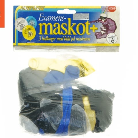 Dette er en pakke med eksamensmaskot pynt fra mærket Partyline. Inde i pakken findes tre balloner med 'Grattis' print og en maskot, der ser ud til at være lavet af plys eller stof. Maskotten har øjne og er en del af festpynten, designet til at fejre eksamen. Pakken har en størrelsesangivelse på 17,5x9 cm.
