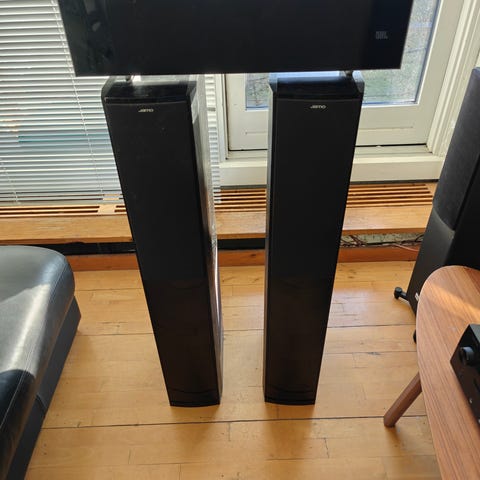 De smukkeste Jamo højttalere i børstet aluminium med en fantastisk klar lyd. Velegnet til surround anlæg. Højttalerne har et slankt elegant design med en rund base. Ret tunge og står solidt.