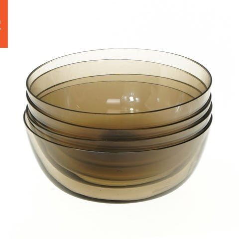 Dette er et sæt af seks skåle i klar glas, hver med en diameter på 14 cm. Skålene har en dekorativ kant med cirkulære mønstre, hvilket giver dem et elegant udseende. De er ideelle til servering af salater, desserter eller små retter.