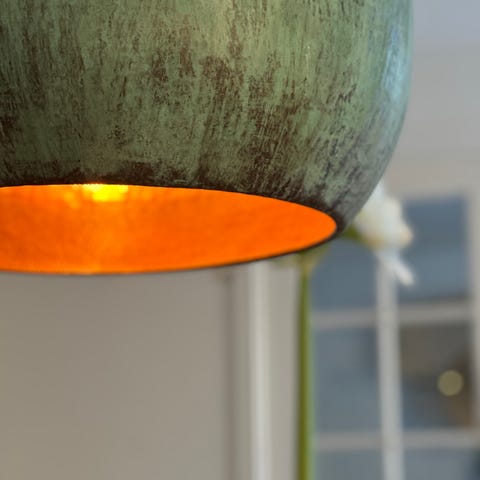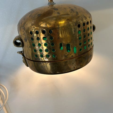 Smuk industriel balinesiske lampe med patina i en kobberfarve der minder om bruneret messing. Måler ø 60 og højde 50 cm.