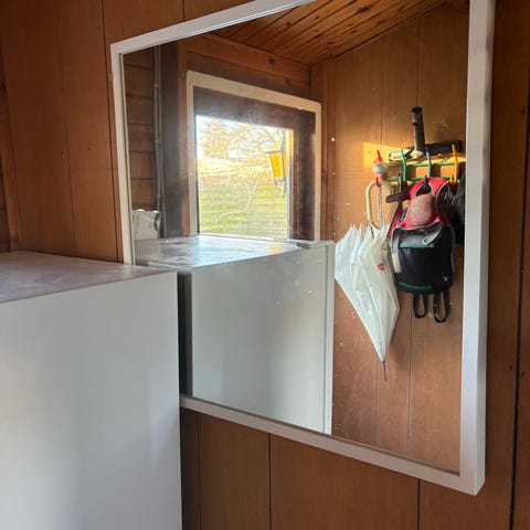 Dette er et firkantet spejl, måler 32,5x32,5 cm, og har en sort ramme. Overfladen af spejlet er klar, men der kan være lidt refleksioner synlige på billederne. Bagsiden er udstyret med fire metalbeslag, der gør det nemt at hænge spejlet op.
