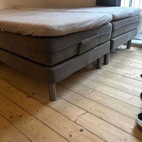 Elevationsenge fra Danske Hilding med Tempsafe madrasser. Sengene har to-funktions elevation, dog har den ene seng defekt motor på elevationen af benene. Hovedgærdet fungerer perfekt. Sengene er forsynet med 22 cm høje stålben, hvilket giver en god frihøjde til støvsugeren.