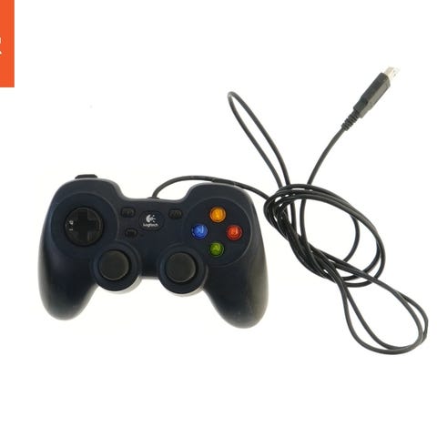 Logitech Dual Action spillecontroller. USB tilslutning til PC. Controlleren har en klassisk design med to analoge joysticks, en D-pad og fire handlingsknapper.