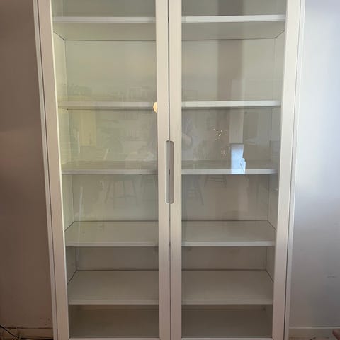Vitrineskab fra ikea i modellen Billy med vitrinelåger. Farven er i en udgået grå. Brugt meget sparsomt, hvorfor det næsten fremstår som nyt.