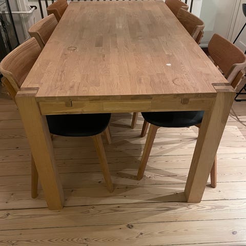 Dejlig stort spisebord i bejset eg sælges grundet pladsmangel. Brugt med børn derfor nogle brugsspor på bordpladen. Ønsker hurtig handel og afhentning.