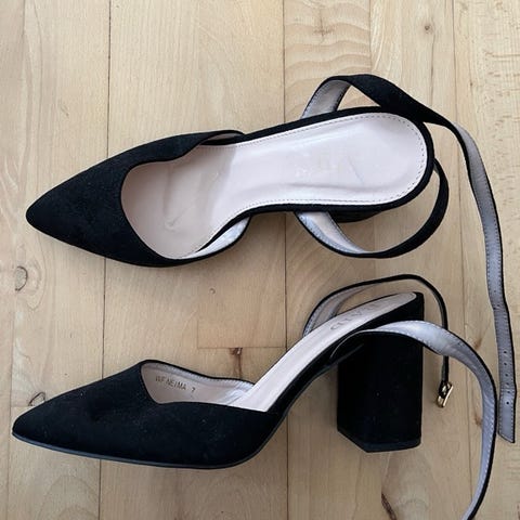 ASOS højhælet sko i størrelse 39. Skoen er orange med “guld” spids og hæl.