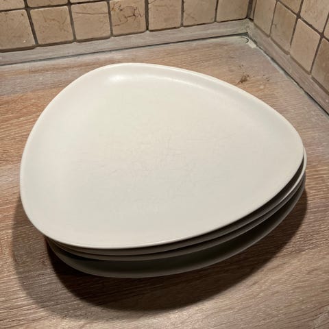 Fra det svenske Höganäs: 1 hvid middagstallerken 26 cm kr100, 1 hvid frokosttallerken 20 cm kr35. 1 krus hvid h 9,5 cm, ø 9 cm med brik i træ kr45. 1 kop i rust følger gratis med ved køb af alle 3 emner, da den er lidt misfarvet indvendigt.