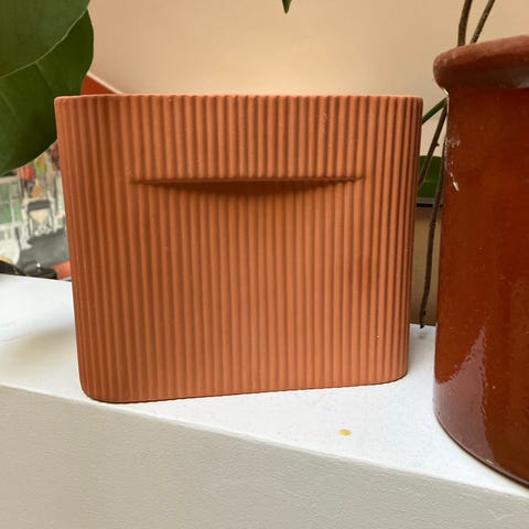 Muuto Vase i beige farve med rillede detaljer. Vasen har en oval form.