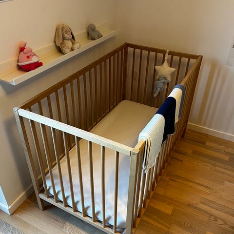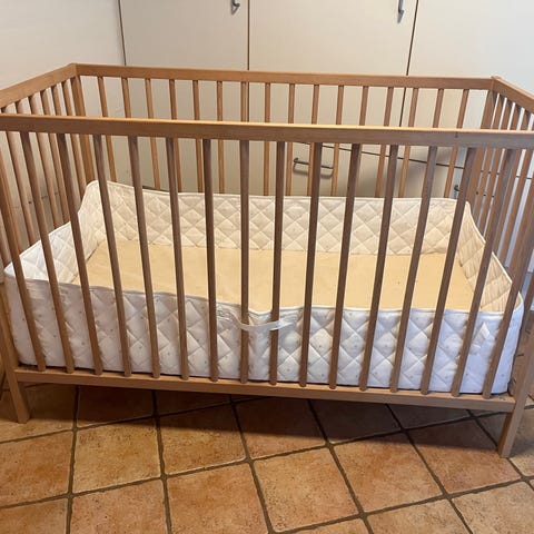 Tremmeseng i træ samt madras til børn