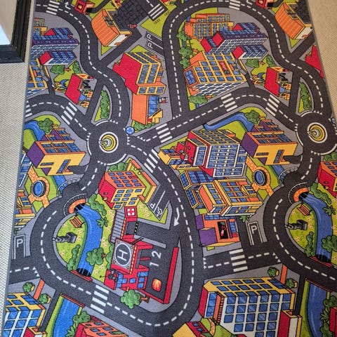 Dette børnetæppe måler 135x75 cm og er prydet med et vejtema. Designet inkluderer veje, trafikskilte, og en helikopterlandingsplads, perfekt til leg med biler og legetøjsfartøjer. Lavet af blødt og holdbart materiale, det er ideelt til at skabe en sjov og stimulerende legeplads for børn på deres værelse eller legeområde. Tæppet har en primært grøn farve med detaljer i grå, blå og andre farver.