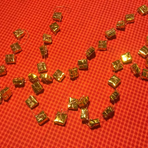 Denne guld guirlande er typisk anvendt til at dekorere juletræer eller til generel dekoration under julefestligheder. Den er lavet af skinnende, guldfarvet metallic materiale, hvilket giver den en festlig og glamorøs udseende. Guirlanden er fleksibel og kan formes rundt om trægrene eller andre dekorative elementer.
