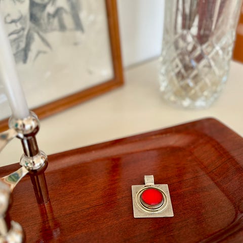 Dette er et vintage smykkevedhæng lavet af metal med en unik tekstur og en central lyslilla sten. Vedhænget har en diameter på 3 cm og har en indgravering på bagsiden, der viser 'Bjørn H. Denmark'. Det har en rund form med en glat bagflade og en lille øsken til kæde eller snor. Det lyslilla hjertesten glas er kuplet og skaber en dyb refleks. Det er ideelt for smykkeentusiaster eller samlere af vintage dansk design.