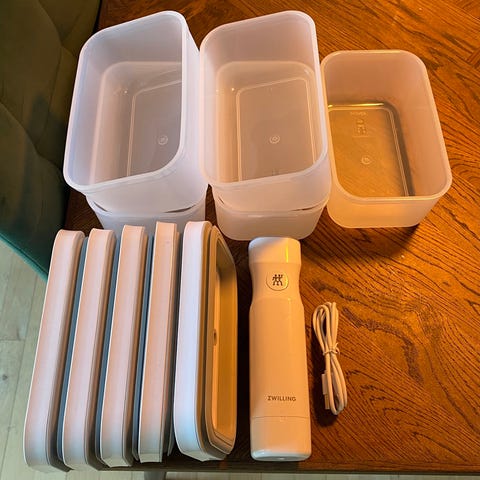 2 stk S og 2 stk M Zwilling Fresh and save genanvendelige vakuumposer inkl marinadeventil, så pumpen ikke ødelægges af en evt væske Holder maden frisk længere og kan bruges i både køleskab, fryser og mikrobølgeovn. OBS du skal bruge en matchende Zwilling vakuumpumpe for at kunne anvende poserne! Købt som en del af et sæt. Ikke brugt ret meget, da boksene passer bedre til min køleskabs/fryser indretning.