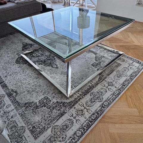 Sidebord med bordplade i glas og stel i metal. Bordet har et moderne design med geometriske former i stellet og en firkantet glasplade. Velegnet som dekorativt møbel til opbevaring eller som støttebord i stuer eller andre opholdsrum.