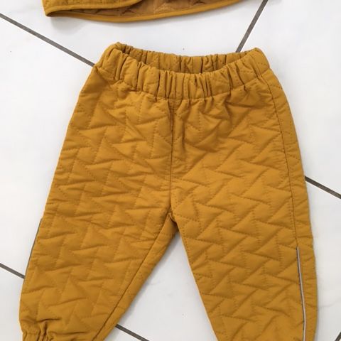 Et par brune termobukser med quiltet design. Bukserne har elastik i taljen og ved anklerne. De har forstærkninger på knæområdet og bagdelen.