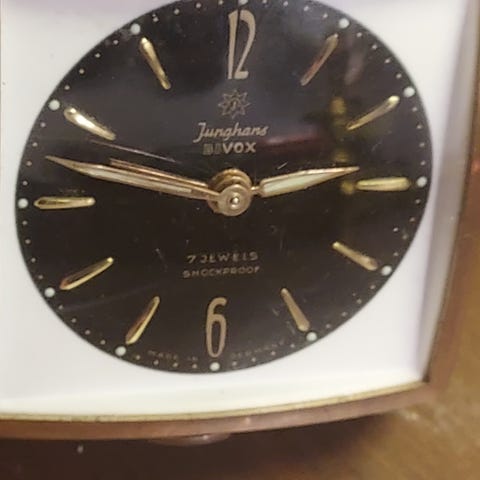 Vækkeuret er et rejseur fra Junghans, med en størrelse på 8x8 cm. Det har en hvid urskive med sorte tal og visere. Kassen er lavet af brun læderlignende materiale med en guldfarvet kant. Uret kommer i en original Junghans æske, markeret med mærket og en modelnummer på siden.