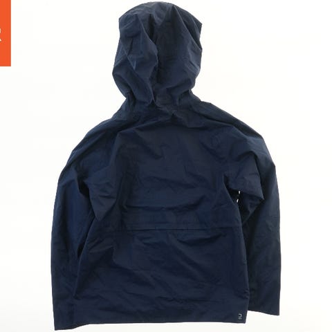 Denne jakke er lavet af vandafvisende materiale og har en hætte til beskyttelse mod regn. Den har elastiske manchetter og en lukning foran med lynlås. Jakken inkluderer også en elastisk strop på siden.