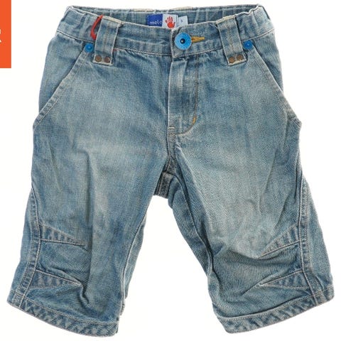 Børnens shorts med lommer foran og bagpå. De bageste lommer har stjernemønster syninger. Shortsene har knaplukning og bæltestropper. Mærket 'Molo Jeans' er synligt bagpå.