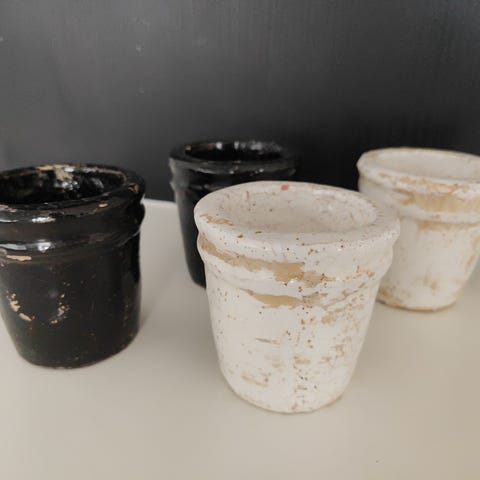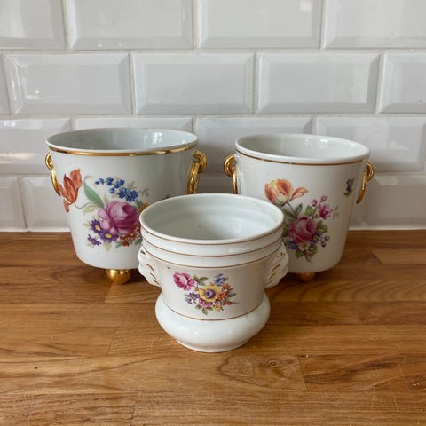 2 blomster krukker, SSF italy 764 464, 2 fine gamle blomster krukker i mørke blå farve med guld kant og guld øre og blomster motiv, mærket SSf italy 764 og 464 i bunden, mål den lille 12 cm høj og 12,5 cm bred og den store er 16 cm høj og 18 cm bred, frit valg 100 kr sendes eller hentes