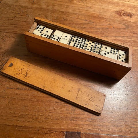 Gammelt Domino spil i trææske (str. 27x6x4,5 cm)