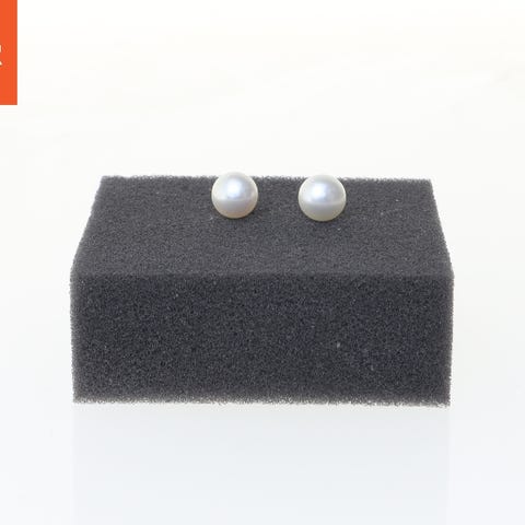 Et sæt af perleøreringe, monteret med små sten på en metalbase. Øreringene har en diameter på 2 cm og en blank overflade. De kommer med skruelåse for sikker fastgørelse.