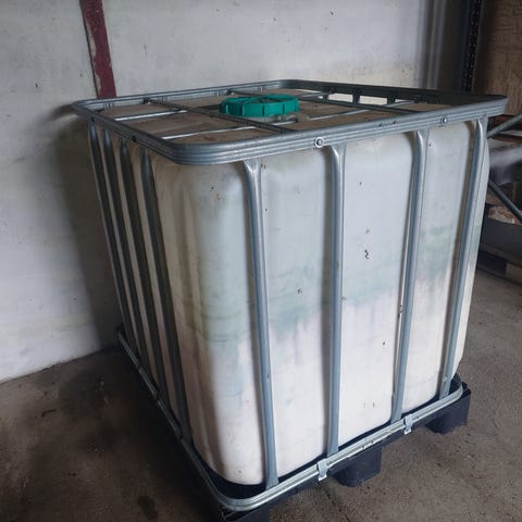 Palletank brugt til opsamling af regnvand til havevanding. Trænger til at blive gjort lidt ren og er ellers i god stand. Hane og slangekobling medfølger.