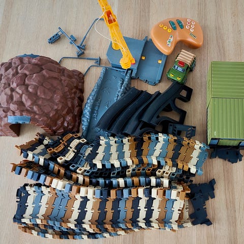 Original Flexi Trax bane med samlet længe på 2,5 meter, som kan bøjes og formes til unikke ruter med broer, tunneler og bakker. Bil medfølger. Nypris 399 kr.
