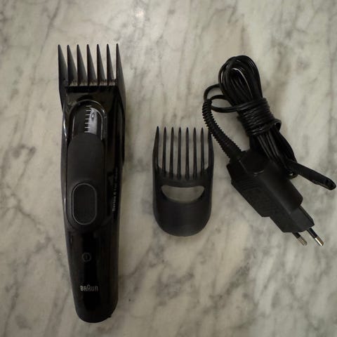 Braun hårtrimmer i sort farve med justerbar kam og ledningsbaseret opladning.