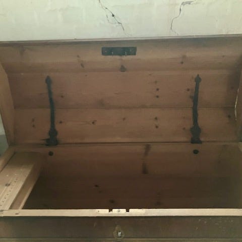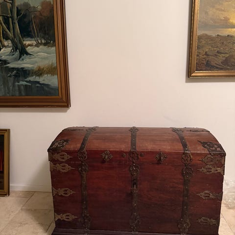 Måler 150* 66, er 74 cm høj. I kisten findes et lille separat rum med trælåg.