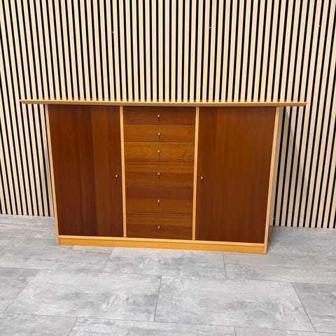 Sort/hvid 3 delt skænk , lågerne er i sort højglans , med push åben og luk system, de 2 smalle måler 30x30x107 cm og den store 122x107x49 cm,