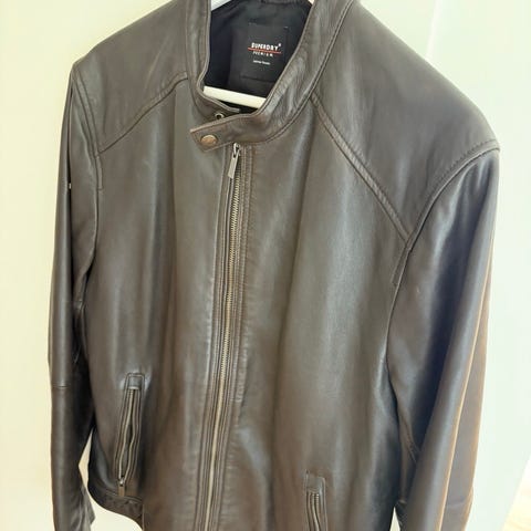 Brun Superdry Limited læderjakke med quiltet design. Vintage. Jakken har flere lommer med lynlås og knaplukning. Den har en høj krave med lynlås og en synlig Superdry logo på venstre ærme. Brugt, alm brugspor og patina, ingen defekter. Kan bruges videre. Str L, lille i størrelse, passer til Medium. Tjek mål på billeder.