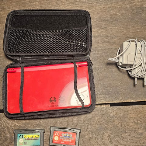 Nintendo DSi XL konsol med tilbehør inkluderer en bærbar spillekonsol, oplader, taske og flere spil. Spil inkluderer: