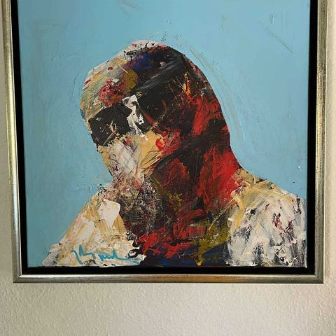 Johnny Madsen maleri i sølvfarvet ramme i målene 104,5 cm. (B) x 85 cm. (H) - dette er rammemål. Købt hos Galleri 7 i Frederikshavn. Kvittering haves. Klassisk motiv fra Madsen med de fire mænd uden ansigter i stærke farver og på laksefarvet baggrund. Seriøse bud modtages.