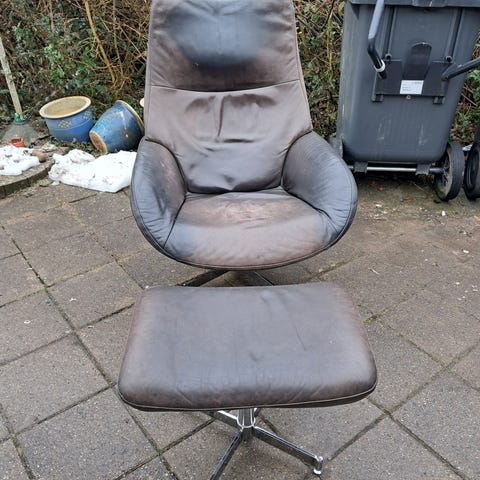 Elegant hvilestol i sort læder. Med praktisk indbygget benstøtte/fodskammel. Den kan let indstilles via et praktisk håndtag, og kan både fungere som lænestol og ligge-/hvilestol. Har drejefod. I pæn stand, men med få skader i læderet se foto.