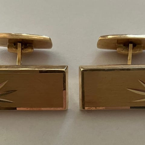 Et sæt smukke guld manchetknapper fra Herman Siersbøl, 8 karat. Dobbelt navnestempel HS HS. Rektangulær form med hhv organisk og præget front. Måler 2,1x2,1 cm. Vægt: 5,49g