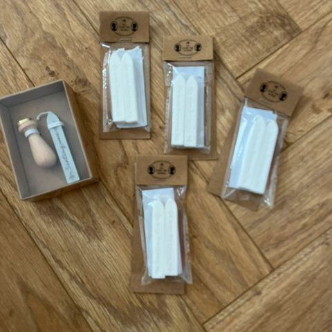 Hobby særligt sæt til segl og voks indeholdende et håndtag, en metalstempel og flere pakker med hvid voksseg. Sættet er beregnet til hobbybrug og kan anvendes til forsegling af breve eller dokumenter.