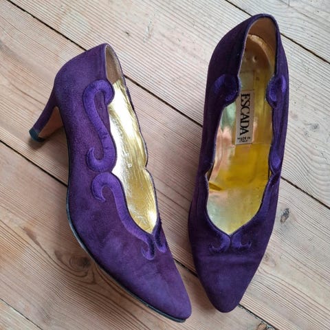 Escada højhælede sko i størrelse 36. Skoene er sorte og har en klassisk, elegant udformning. Materialet er ruskind og hælhøjden er 6,5 cm. Skoene har en spids tå og smal hæl, hvilket gør dem velegnede til formelle eller festlige lejligheder.