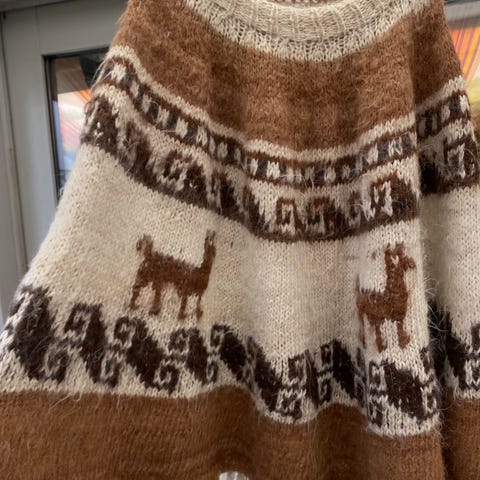 Poncho med rullekrave i ren uld. Med snoninger og hulmønster. Strikket ovenfra og ned.