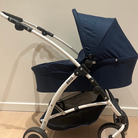 BRIO barnevogn med sort stel og klapvognsdesign. Barnevognen har et hvidt stel med fire hjul, justerbart håndtag og sort tekstilmateriale. Designet til at give komfort og funktionalitet ved transport af børn.