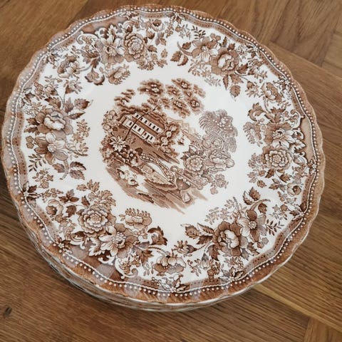 4 smukke dybe tallerkener af Burleigh, Staffordshire, England. De er i flot stand og 17,5 cm i diameter. Alle 4 sælges for 100 kr. De sendes ikke, men kan hentes i Lyngby eller centralt i København