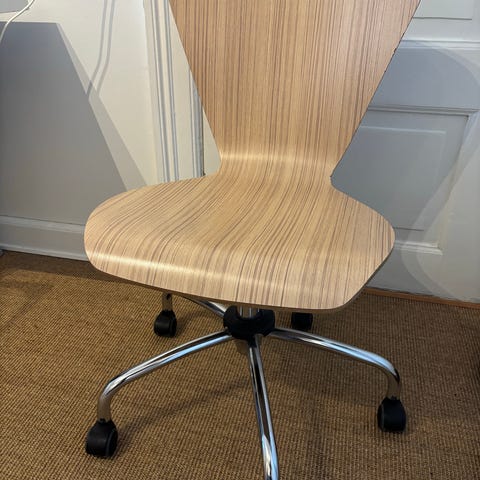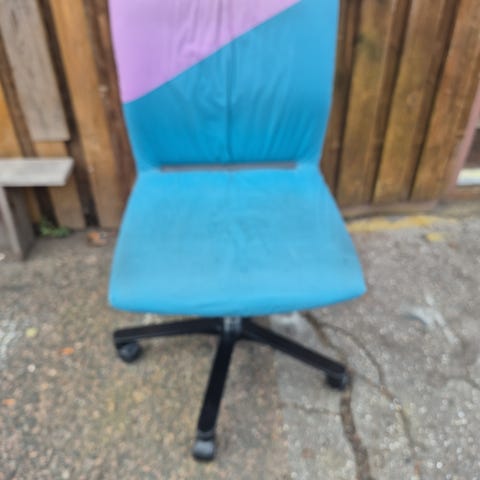 Ældre fuldpolstret kontorstol med mørkerødt stof.