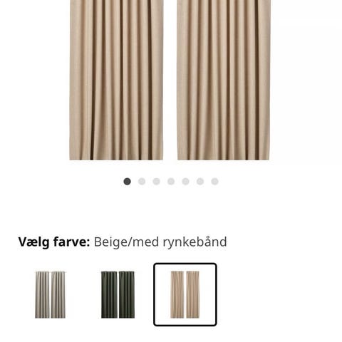 Et sæt beige mørklægningsgardiner fra IKEA sælges. De er blevet tilpasset i længden hos en skrædder. Hvis man er interesseret ligger jeg inde med to sæt beige mørklægningsgardiner, som jeg kan sælge for 350 kr., hvis man køber begge sæt gardiner samlet. Der kan følge gardinringe med gratis, hvis det har interesse.
