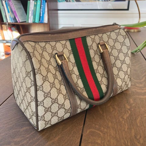 Gucci stoftaske til unisex med karakteristisk mønster og grøn-rød-grøn stribe. Tasken har en justerbar skulderrem, gyldne metaldetaljer inklusive logo og lynlås. Indvendigt foret med flere rum til opbevaring.