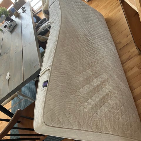Gives væk. Har været brugt for nogle år tilbage i et par år. Ingen huller men mærker efter brug. Der er et vaskbart betræk på i meget god kvalitet som lige er blevet vasket. Har været opbevaret i tørt og varmt atelier- ingen grim lugt eller andet, men der som foto viser brugs mærker. Meget lækker kvalitet, kostede over 1000kr fra ny.