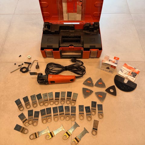 Fein SuperCut multiværktøj i orange med tilbehør og opbevaringskasse. Værktøjet er designet til præcisionsarbejde og kan anvendes til forskellige skære- og slibeopgaver. Kommer i en robust opbevaringskasse med indsatser til tilbehør.