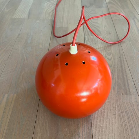 Orangerød kuglependel designet ved E. S. Horn i slutningen af 60’erne. Pæn stand, dog er lidt af farven skallet af øverst omkring ledningen.