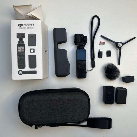 DJI Pocket 2 Creator Combo kamera med kompakt design og indbygget skærm. Kommer med tilbehør som oplader, ekstra batteri, mikrofon, og forskellige monteringsdele.
