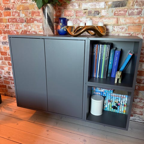 Vi sælger vægskabet, fordi vi ikke skal bruge det mere. Vi har haft skabet stående i næsten 5 år og har besluttet, at vi nok ikke kommer til at bruge det. Skabet har været brugt som en "IT-hylde" til router i vores gamle lejlighed i perioden fra købsdatoen til ca. maj 2021. Der er derfor to udskæringer til kabler i bagpladen og to fordybninger i bundpladen bagerst, så kablerne kunne komme op i skabet.